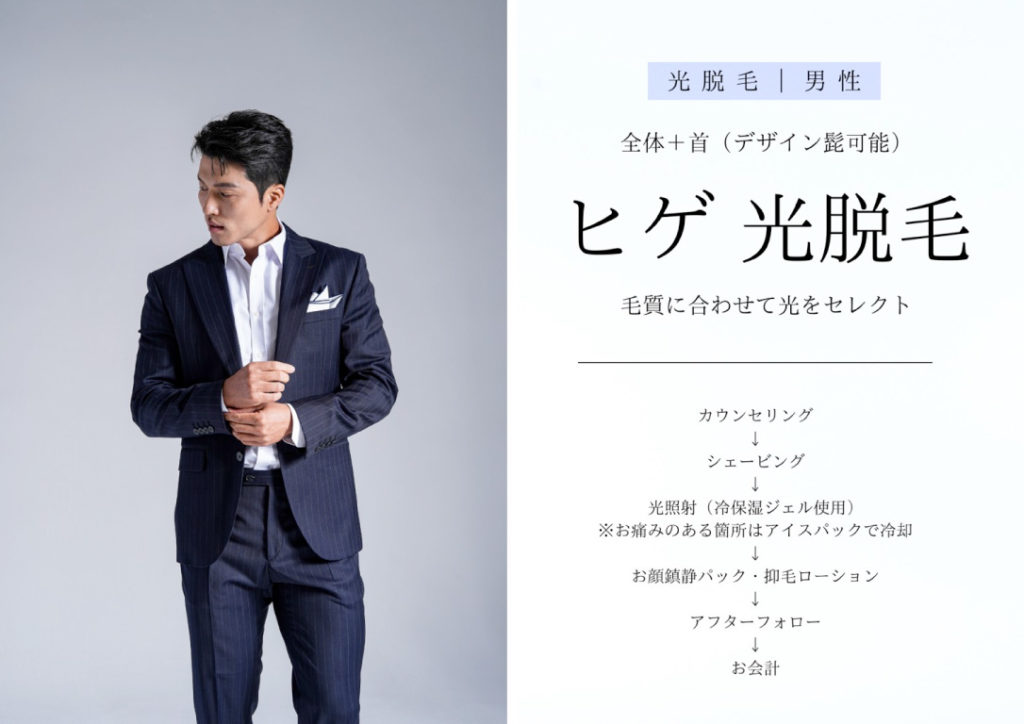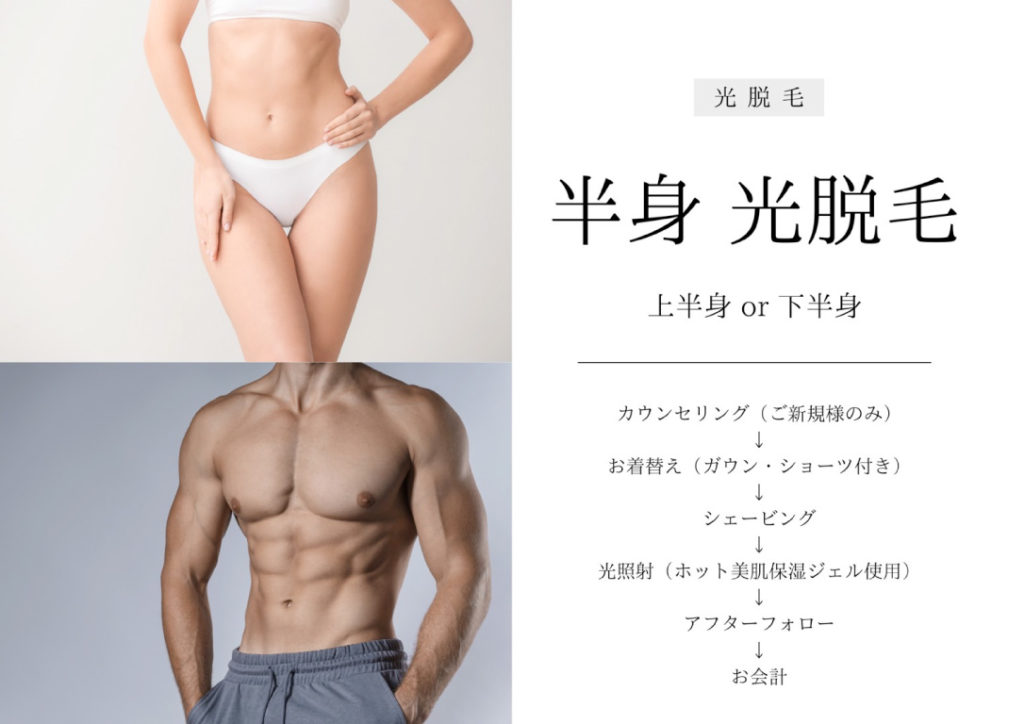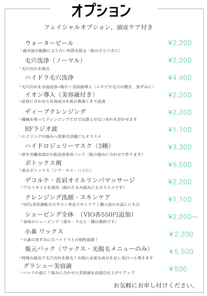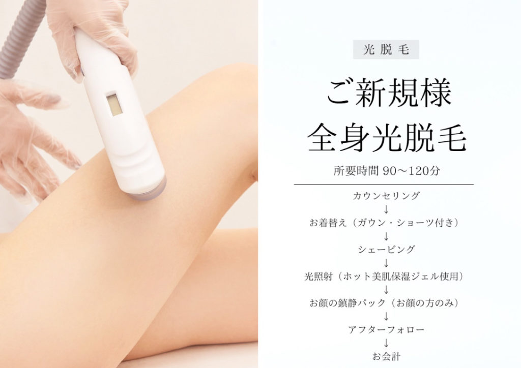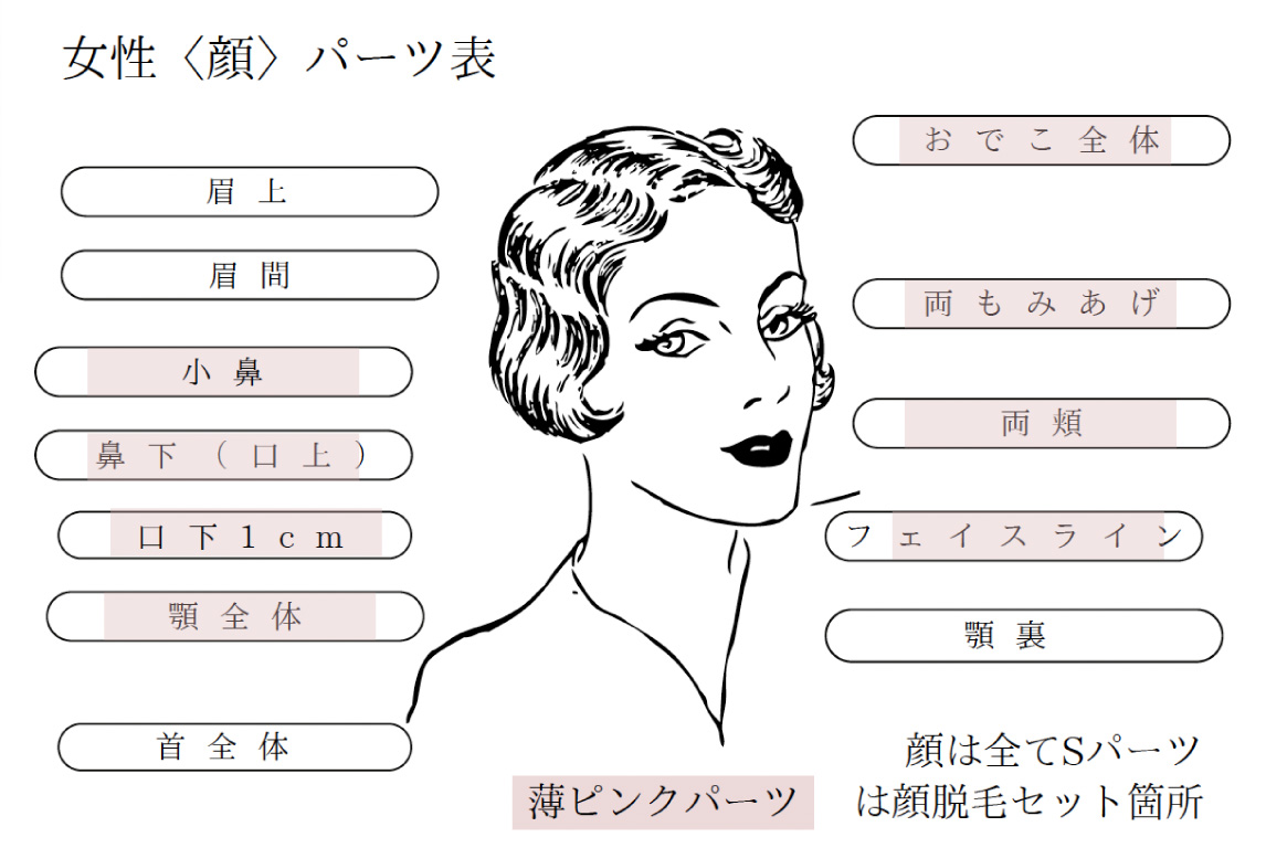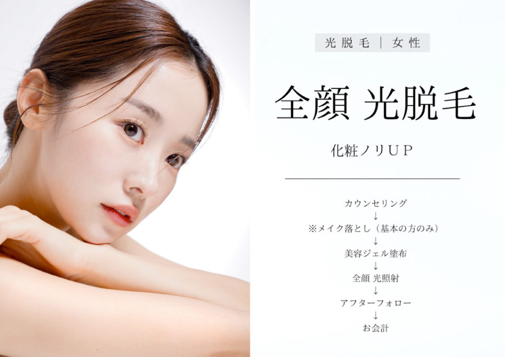 フェイス脱毛は、クールダウントリートメント付き。脱毛希望箇所は事前にシェービングしていただくようお願いいたします。(当日はなるべくお控えください)